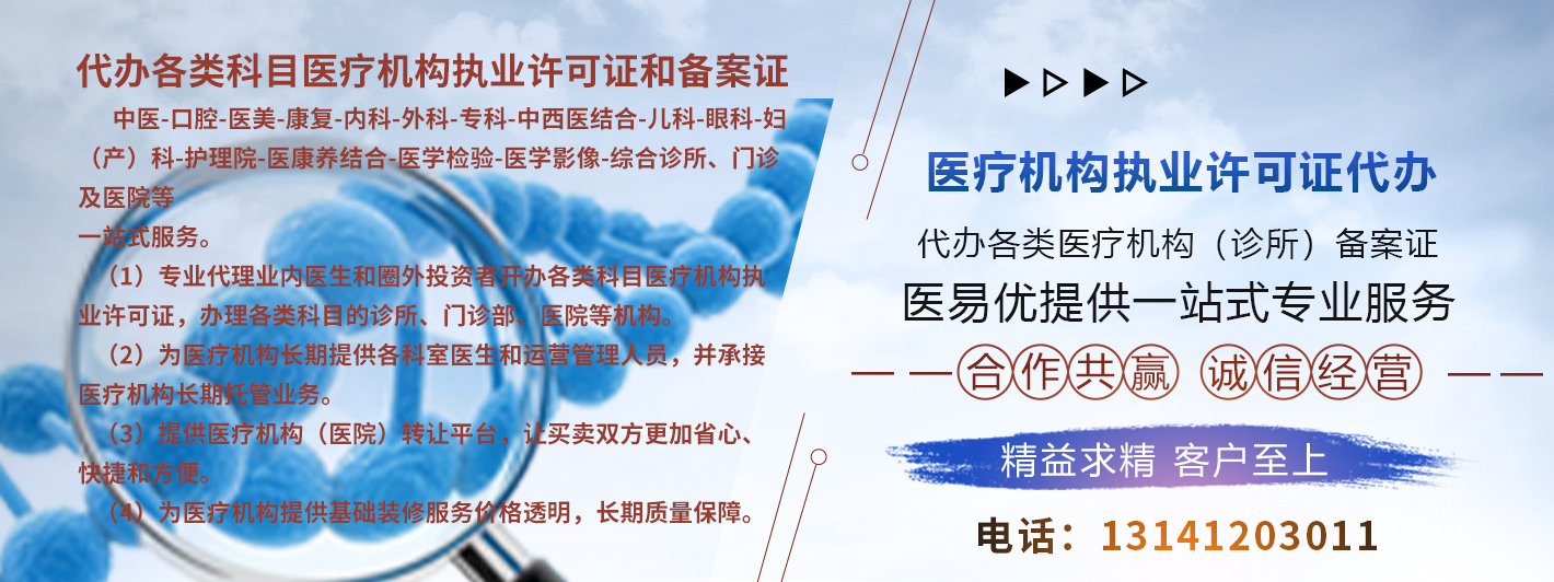 北京医易优公共关系顾问有限公司专业代理业内医生和圈外投资者开设各类医疗机构,办理诊所、门诊部、医院等医疗机构执业许可证。55个临床诊疗学科,我们皆可办理。术业有专攻,我们只做医疗机构资质审批,让我们的客户更加安心、放心、舒心。北京医易优公共关系顾问有限公司成立两年有余,随年限不长,但是公司创始人从事医疗行政行业整整9年有余,背后更是拥有多位在医疗事业单位退居二线的领导顾问团,在成立正规化公司的两年里,我们与中国中医药出版社、宝石花医疗集团和珠江医疗达成长期战略发展合作,公司法人更是担任众多国企私企的独家医疗顾问,以超强的专业技术协助大家落地基层医疗,服务社会回馈国家。